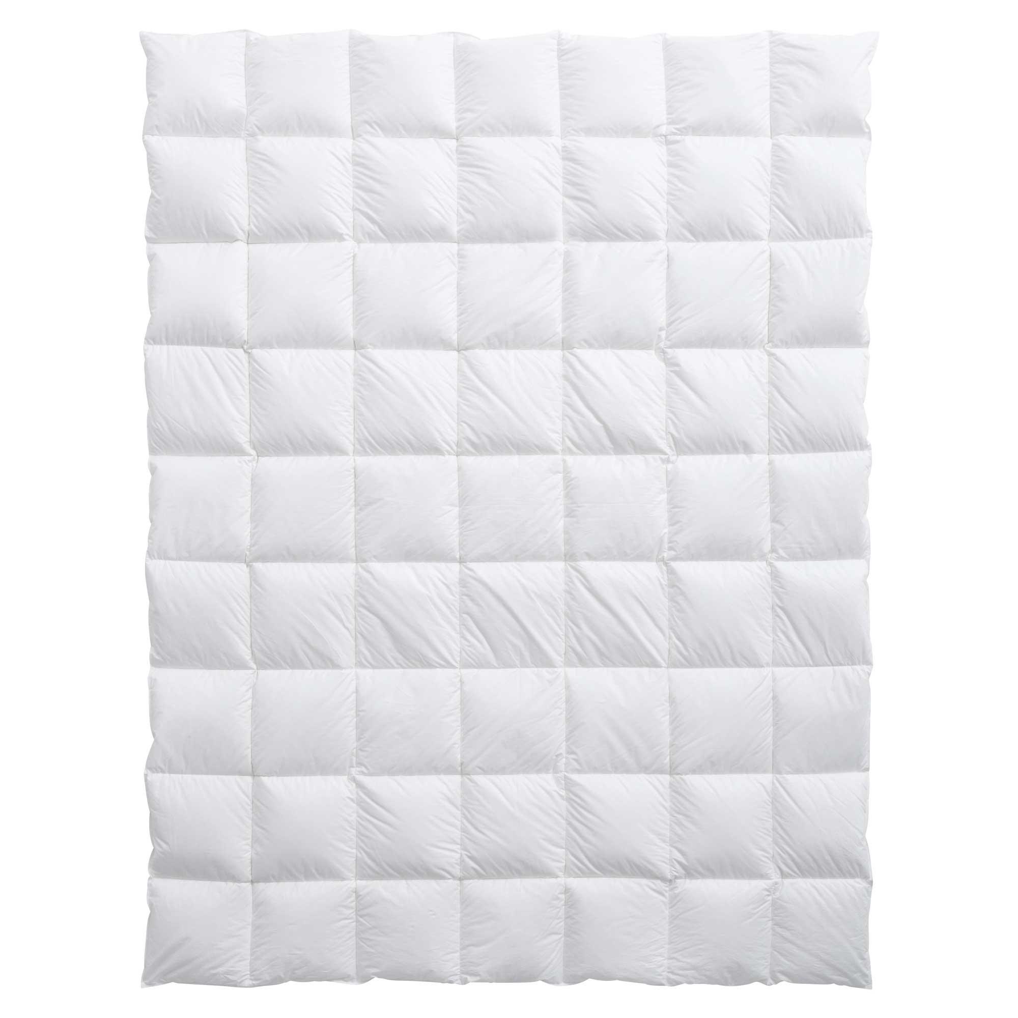 Questo piumone classico è trapuntato a quadrati chiusi che impediscono lo scivolamento dell'imbottitura. È un piumone leggero adatto per la mezza stagione e per le persone con minori esigenze di calore. È particolarmente adatto per i letti ad acqua e presenta una protezione anti-acaro naturale NOMITE.