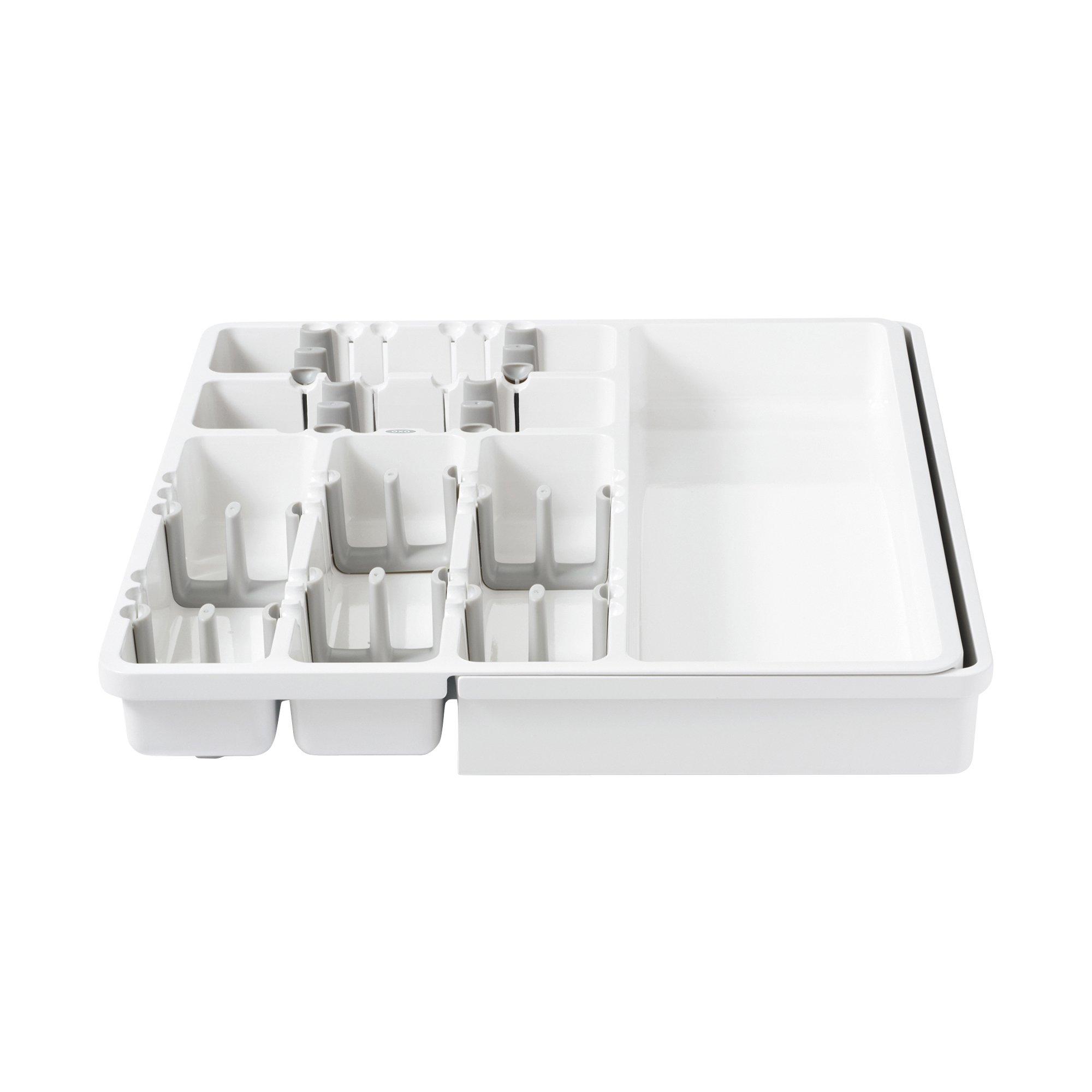 Questa scatola per posate firmata OXO assicura l'ordine nel cassetto. I divisori regolabili consentono di disporre le posate su entrambi i lati e di risparmiare spazio. Il compartimento estraibile offre spazio aggiuntivo per utensili più grandi.