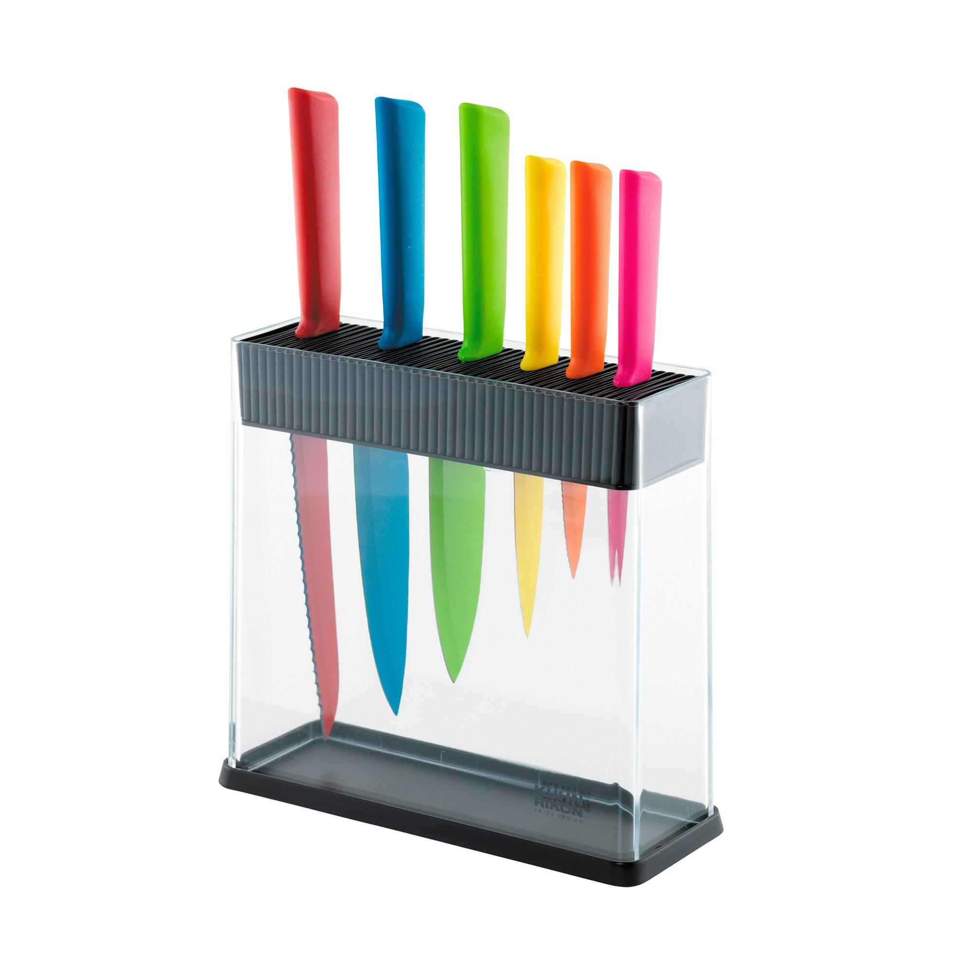 Questo portacoltelli da 7 pezzi di Kuhn Rikon è indispensabile per la tua cucina. Contiene sei diversi coltelli, tutti utilizzabili in cucina. I coltelli hanno lame molto affilate e un design allegro.