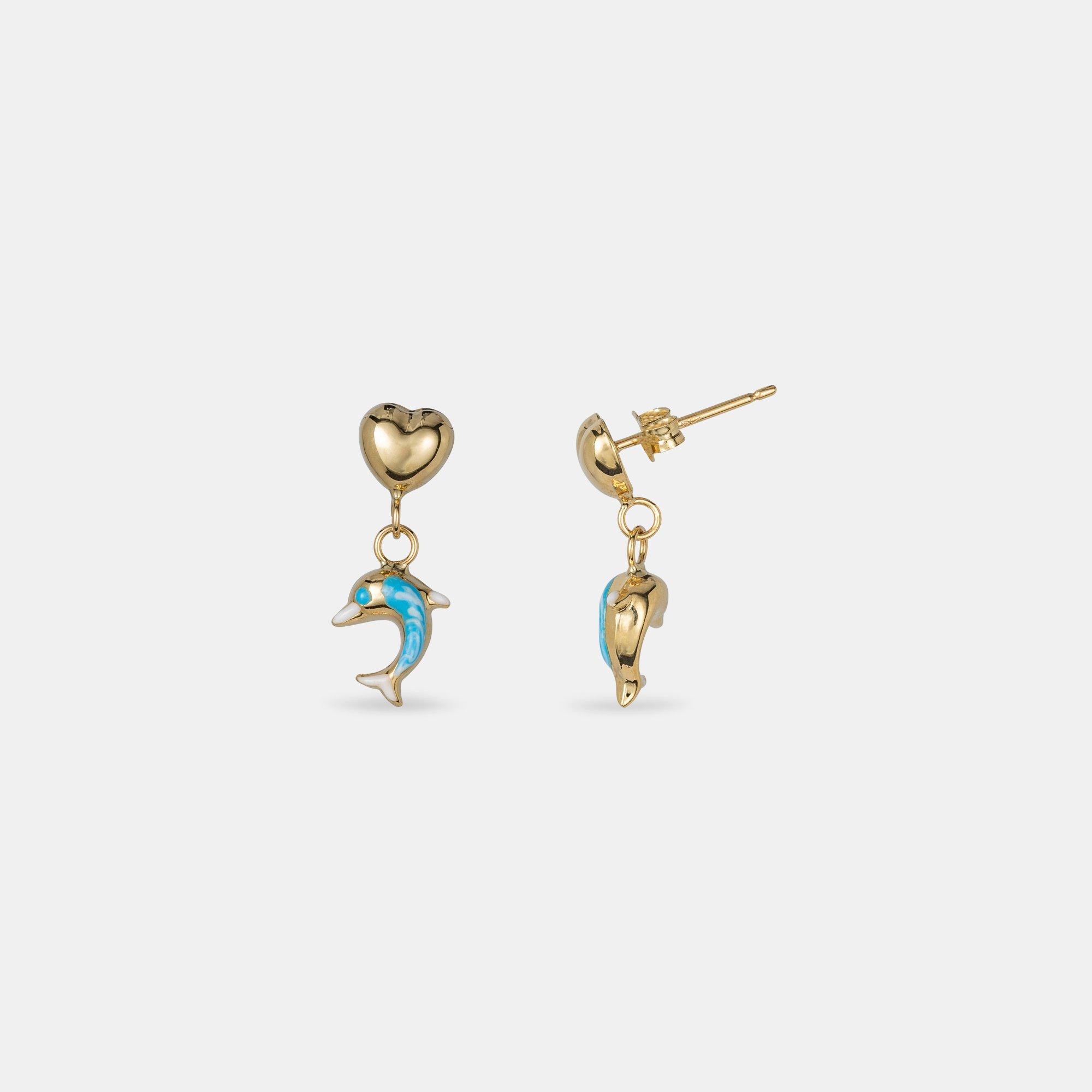 Questi graziosi orecchini a perno del marchio Caramel realizzati in vero oro giallo 18 carati sfoggiano un ciondolo a forma di delfino smaltato e un cuore.