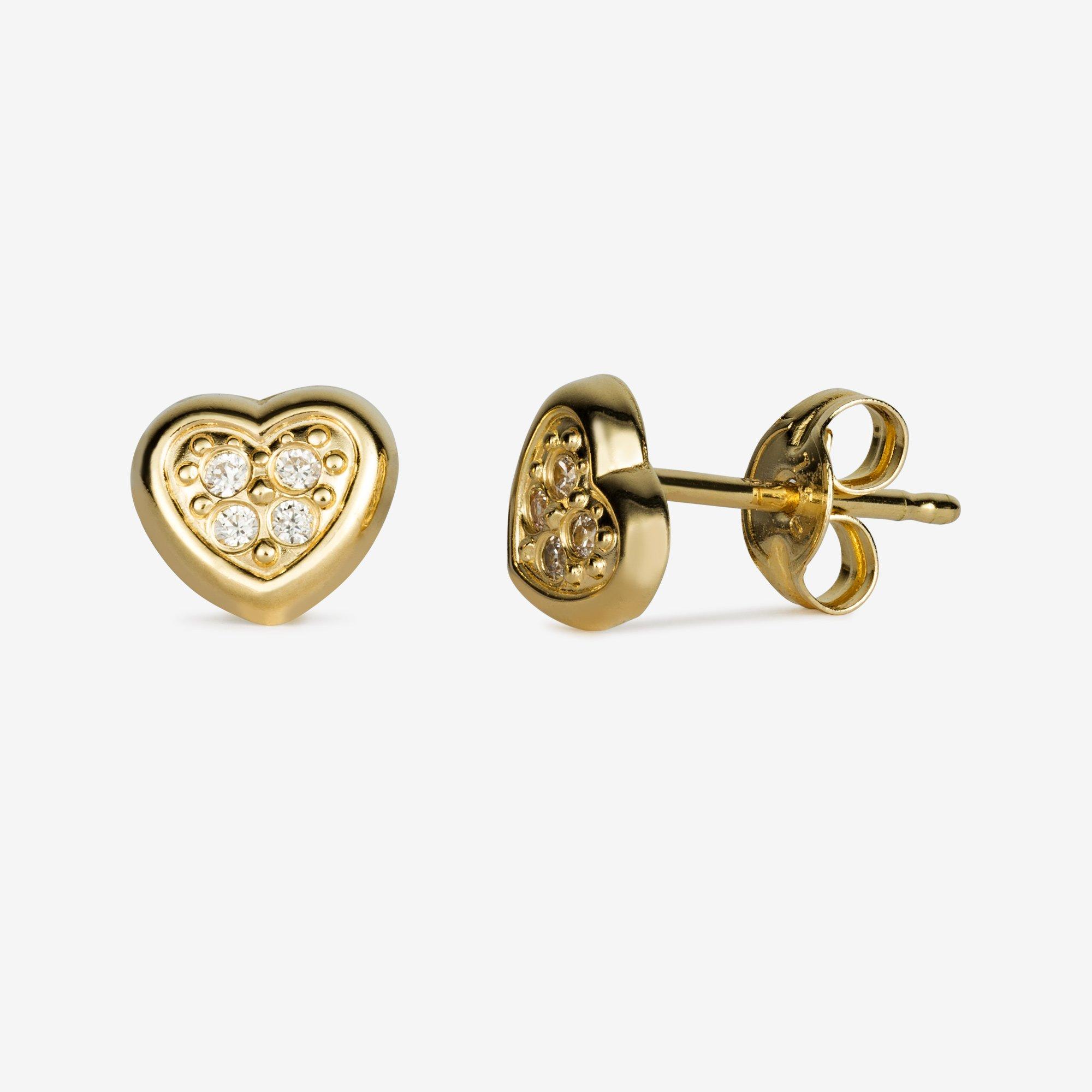 Gli orecchini a forma di cuore del marchio Caramel sono realizzati in oro giallo a 18 carati e sono impreziositi da zirconi sfaccettati. Un accessorio meraviglioso che conquista il cuore.