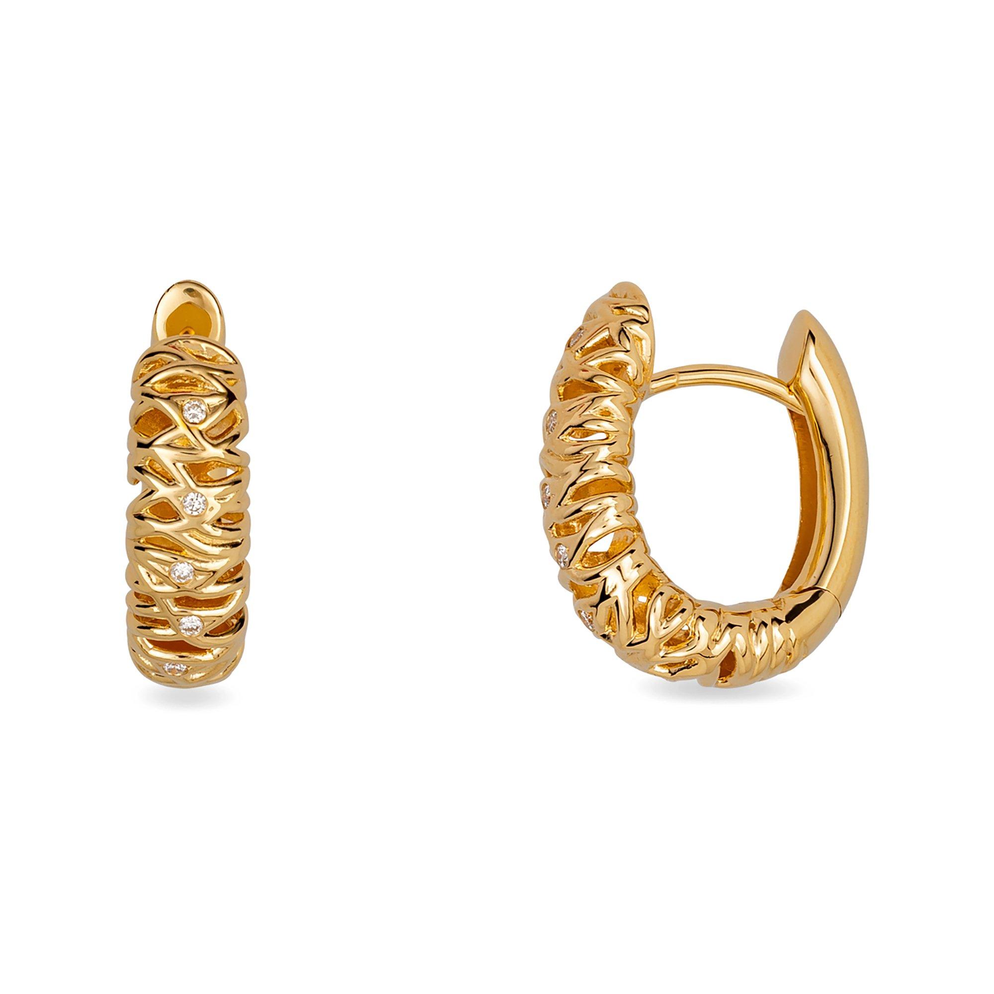 Orecchini a cerchio straordinariamente fabbricati dal laboratorio di gioielli di Sergio Ferris. Nell'oro riccamente intrecciato (18 carati) ci sono 4 diamanti ciascuno, che sono fissati da un'incastonatura lucidata. Questa forma di incastonatura garantisce una protezione ottimale dei gioielli.