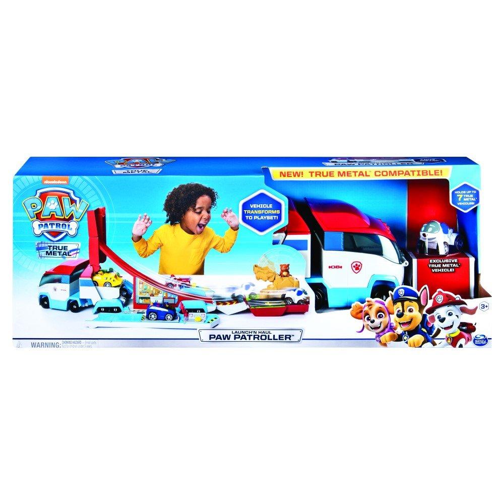 La bella versione del Paw Patrol truck True Metal può essere aperta ad un set completo di giochi con rampa di sollevamento catapulta e altro ancora. Il camion in scala 1:55 contiene il veicolo True Metal Robodog, una figura animale e una parete antincendio e offre spazio per un totale di 7 veicoli della serie True Metal.