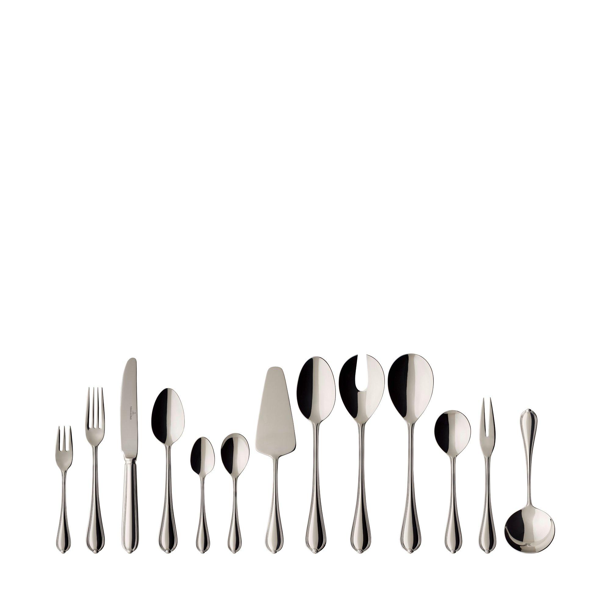 Serie di posate femminile dal design classico: questa è la collezione Emily di Villeroy & Boch. Le linee decorative in filigrana sul davanti e sul retro rendono questa collezione davvero speciale. Il servizio di posate da 68 pezzi è composto da dodici coltelli, forchette, cucchiai, cucchiaini da caffè e forchette da torta, oltre a utensili da portata.