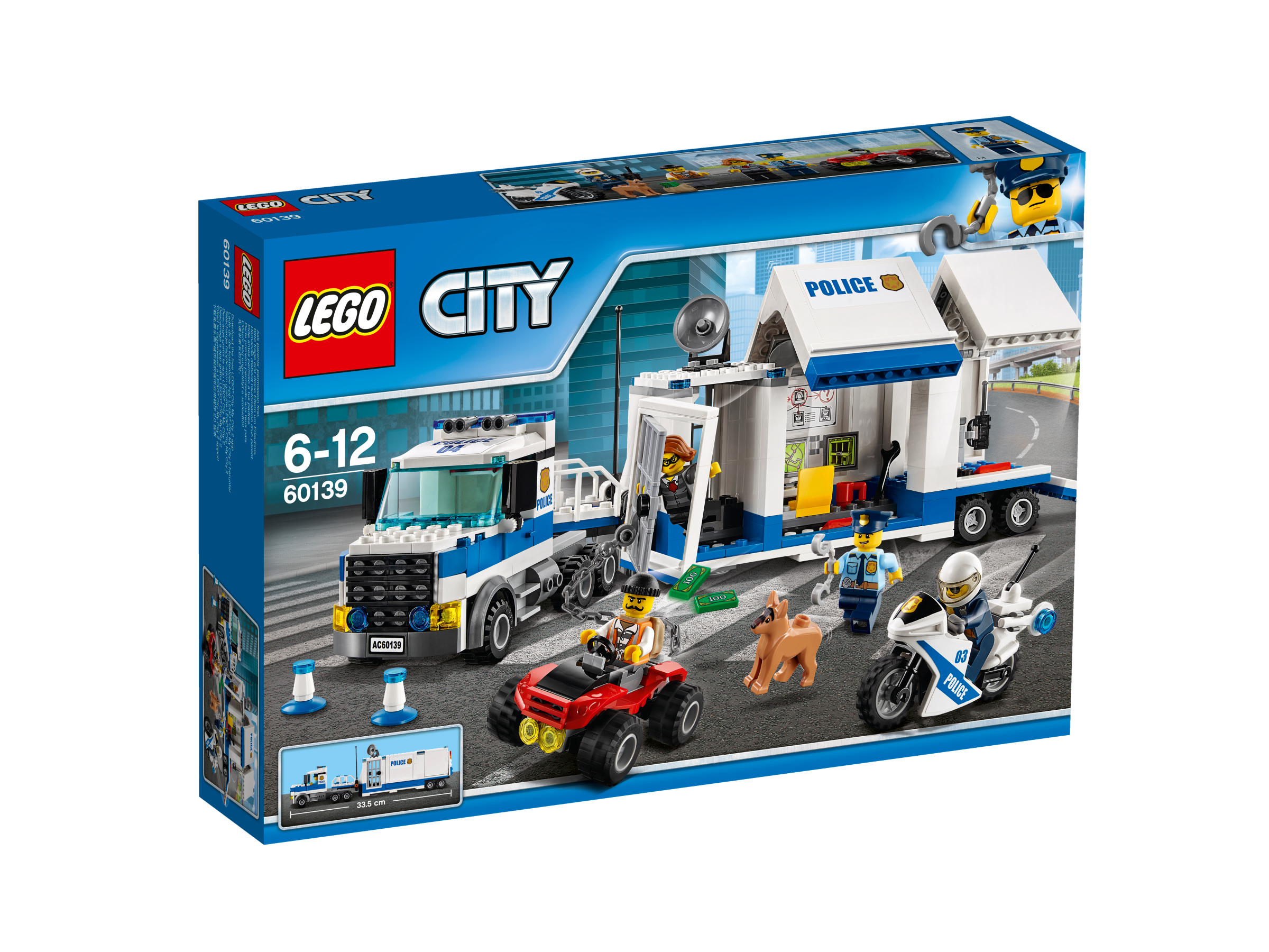 Partecipa all’azione con la polizia di LEGO® City e ferma il ladro in fuga dalla cella del Centro di comando mobile, dotato di cabina di camion staccabile, spazio per due minifigure, sala di monitoraggio con schermi, antenna satellitare, tetto apribile, porte laterali e rampa posteriore, area di magazzinaggio per la moto e gli attrezzi e una funzione di evasione dalla cella, più l'ATV dei ladri. Include 4 minifigure e un cane della polizia.