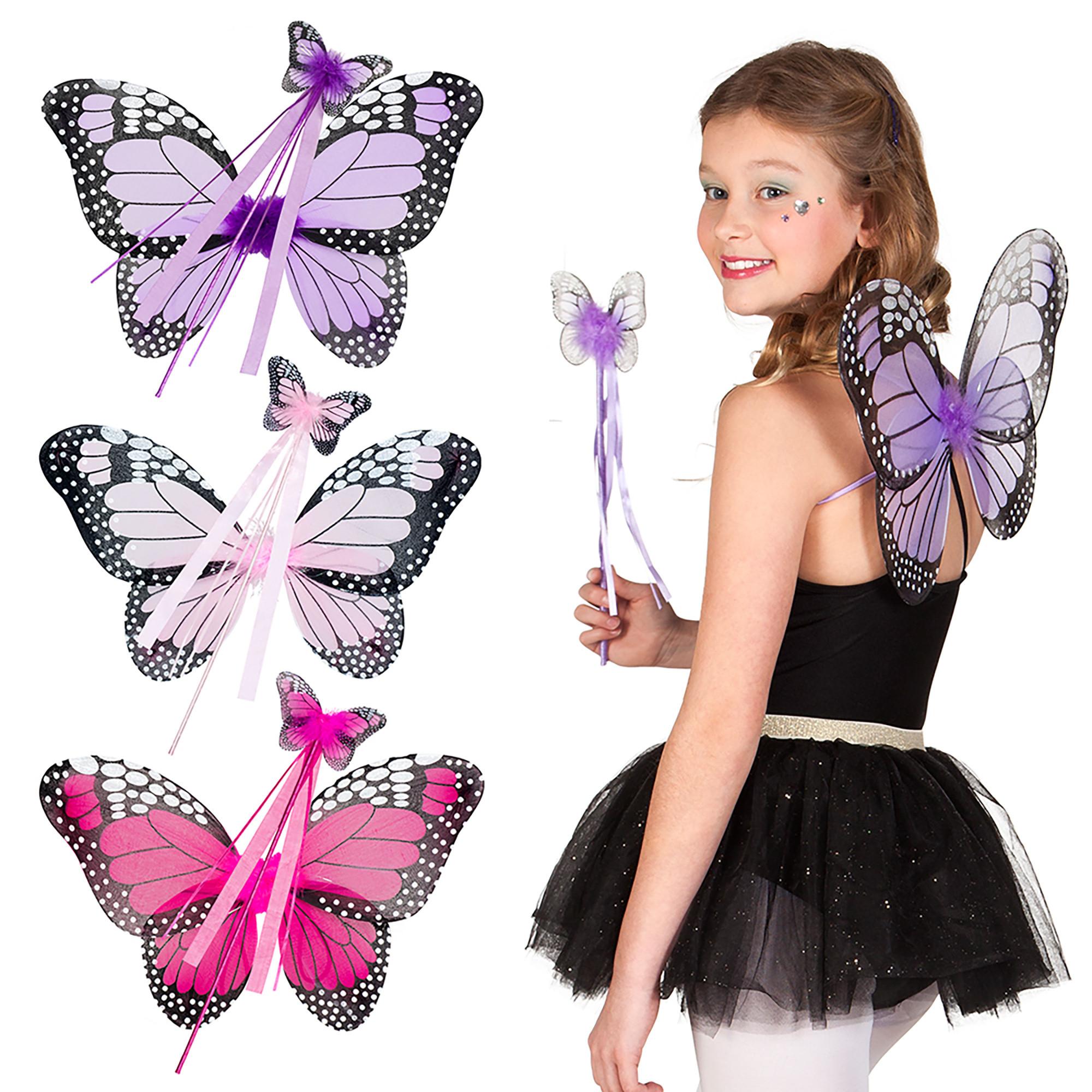 Set farfalla 3 colori assortiti (ali e bastone): Questo set è composto da ali e bastone, realizzati in 85% poliestere, 10% ferro, 3% polipropilene e 2% piume di pollo. Adatto alle bambine a partire dai tre anni di età, è certificato CE ed è confezionato in un cartoncino.