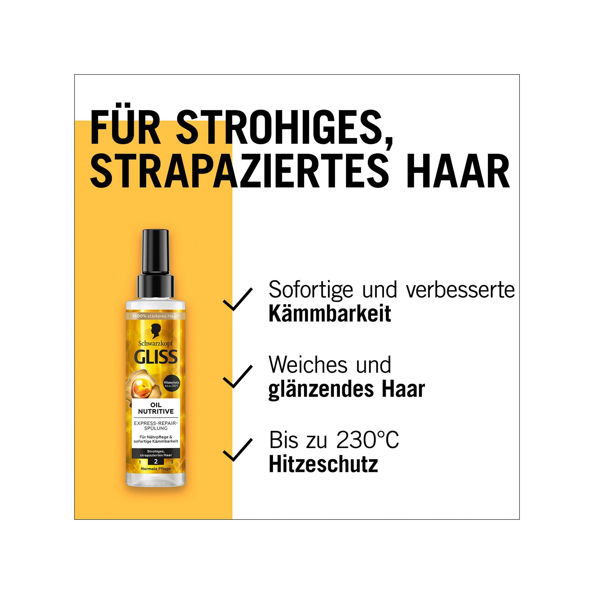 - Trattamento nutriente e morbidezza - Il balsamo Gliss Oil Nutritive Express Repair offre un trattamento nutriente intensivo, pettinabilità immediata e protezione termica fino a 230 °C.