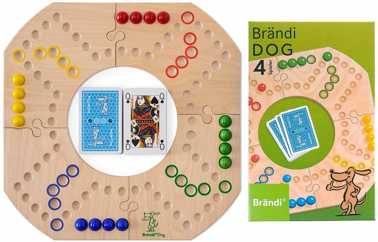 Brändi Dog è un emozionante gioco da tavolo con una motivazione a lungo termine, giocato a squadre e con le carte del bridge. Ha delle analogie con il "pressato per il tempo", ma è molto più vario a causa degli elementi tattici. Siete supportati dal vostro partner di squadra e "mandati a casa" dall'altra parte. Le carte estratte a caso determinano il vostro progresso. I valori delle carte possono essere suddivisi in mosse o tra i partner della squadra. Il vincitore è la squadra che raccoglie abilmente le biglie e le porta per prima al traguardo. Gli elementi in legno accuratamente trattati sono facili da trasportare e possono essere facilmente assemblati per formare un bellissimo tavolo da gioco.