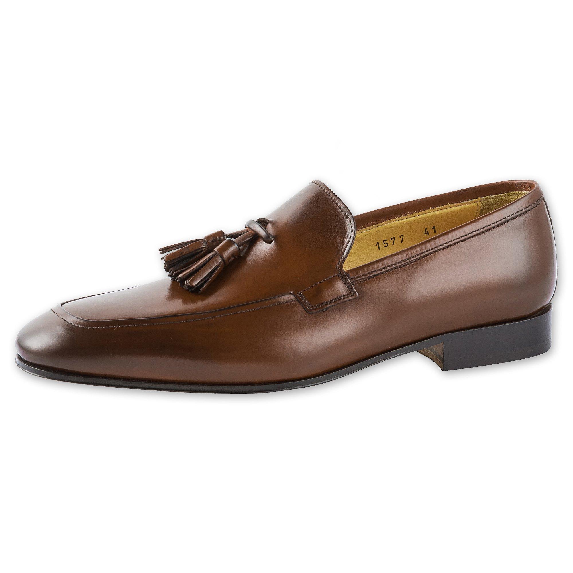 Elegante, incisivo, italiano. Classico mocassino da uomo in pelle di gran pregio con suola liscia in cuoio, ornato da doppia nappina. Il taglio deciso e la realizzazione curata rendono questa scarpa un esemplare unico nel suo genere. Per uomini che sanno come una scarpa eccellente sia indispensabile per un'entrata in scena da signore. Altezza del tacco: 2 cm