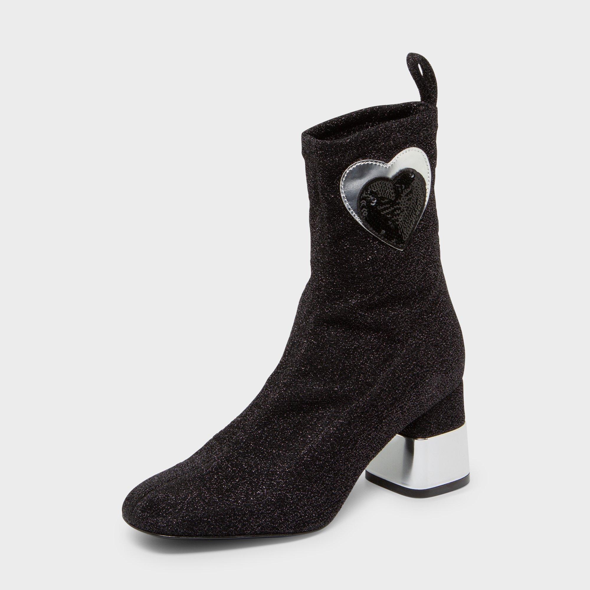 L'elegante stivaletto è realizzato in un tessuto simile a una calza, con un filato in lurex che si adatta perfettamente al piede e al tallone. Il tacco è in parte realizzato in metallo e all'esterno sfoggia un doppio cuore allegro ed elegante in look metallizzato.