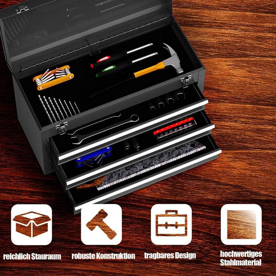 B2XCassetta degli attrezzi in metallo con 3 cassetti e scomparto superiore cassetta degli attrezzi 52 x 21 x 30 cm nera