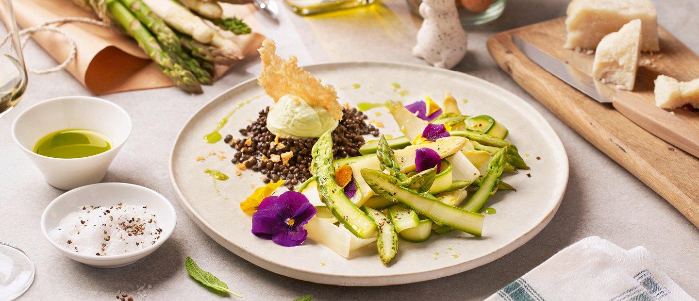 Mousse di asparagi: sbucciare gli asparagi, lessarli in acqua salata bollente per 1 minuto, poi sciacquarli in acqua e ghiaccio. Sbattere due terzi della panna intera e mettere in frigo. Sbucciare e grattugiare lo zenzero e spremere il succo a mano. Mescolare il succo di zenzero con la panna rimanente e frullare con gli asparagi. Condire con sale e pepe. In un’altra ciotola, sbattere il mascarpone con una frusta a filo fino a renderlo morbido, aggiungere la purea di asparagi e incorporare delicatamente la panna montata in due fasi. Lasciar raffreddare in frigo per 2-3 ore.