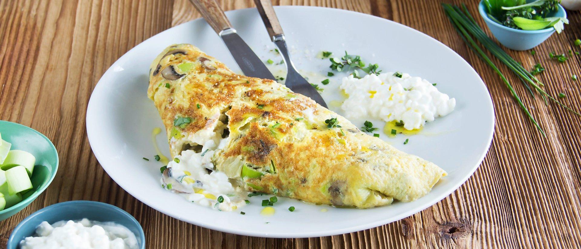 Omelette con ripieno di porri, champignon e fiocchi di latte